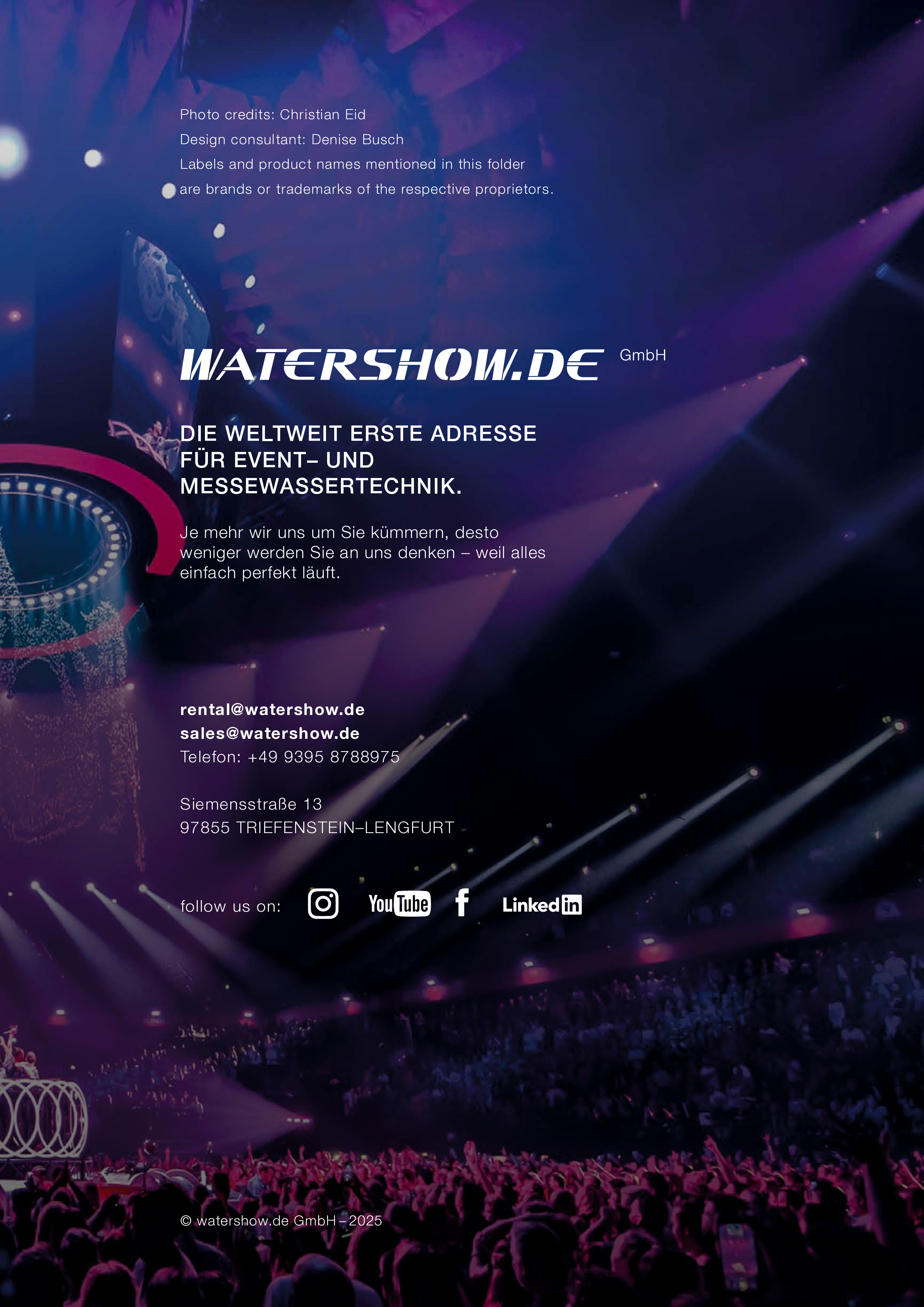 Watershow.de GmbH verwandelt Wasser in unvergessliche Erlebnisse. Von funkelnden Fontänen und eleganten Wasserwänden bis hin zu hochmodernen Wasserscreens, die Logos und Bilder mit fallenden Tropfen schreiben. Jede Show ist ein einzigartiges Highlight. Mit individuellen Lösungen, perfekter Technik und beeindruckender visueller Wirkung lässt Watershow.de Marken erstrahlen und Events unvergesslich werden.
